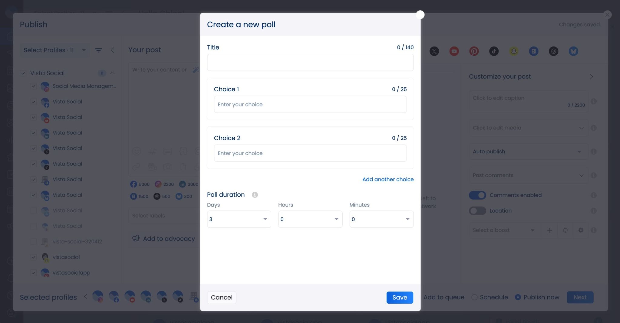 - Poll scheduling: You can now schedule polls for all platforms—even ones that don’t natively support them—right inside Vista Social. Select the poll option in the scheduler and add in your options.
