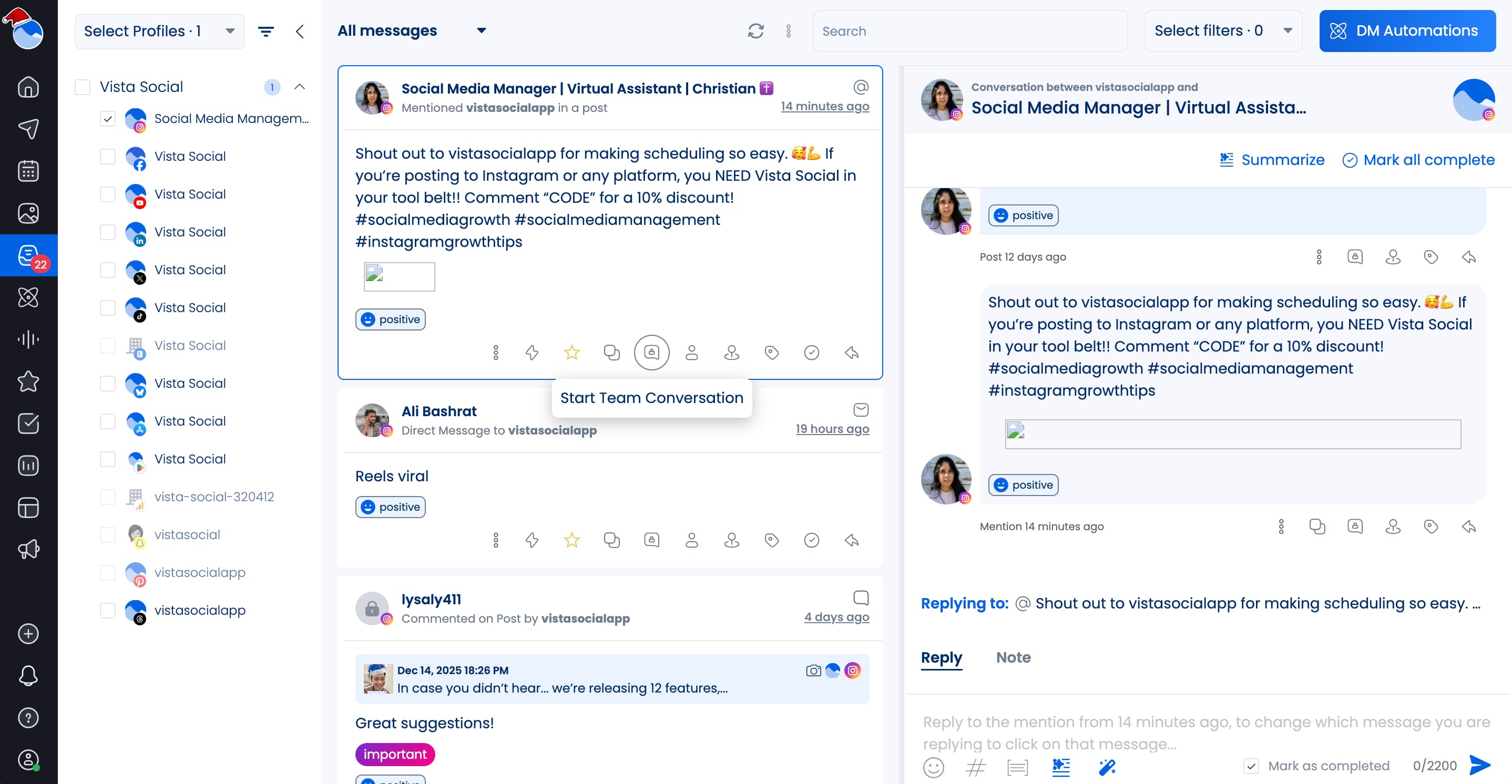 - Team conversations in the social inbox: Create internal conversations around comments or messages so you know who’s handling what, you can get approval on responses, and you can stay on top of every customer conversation.
