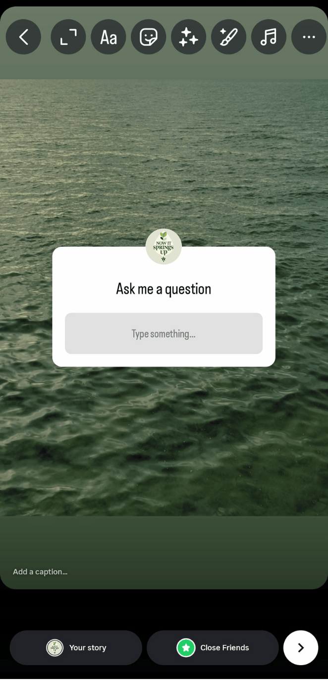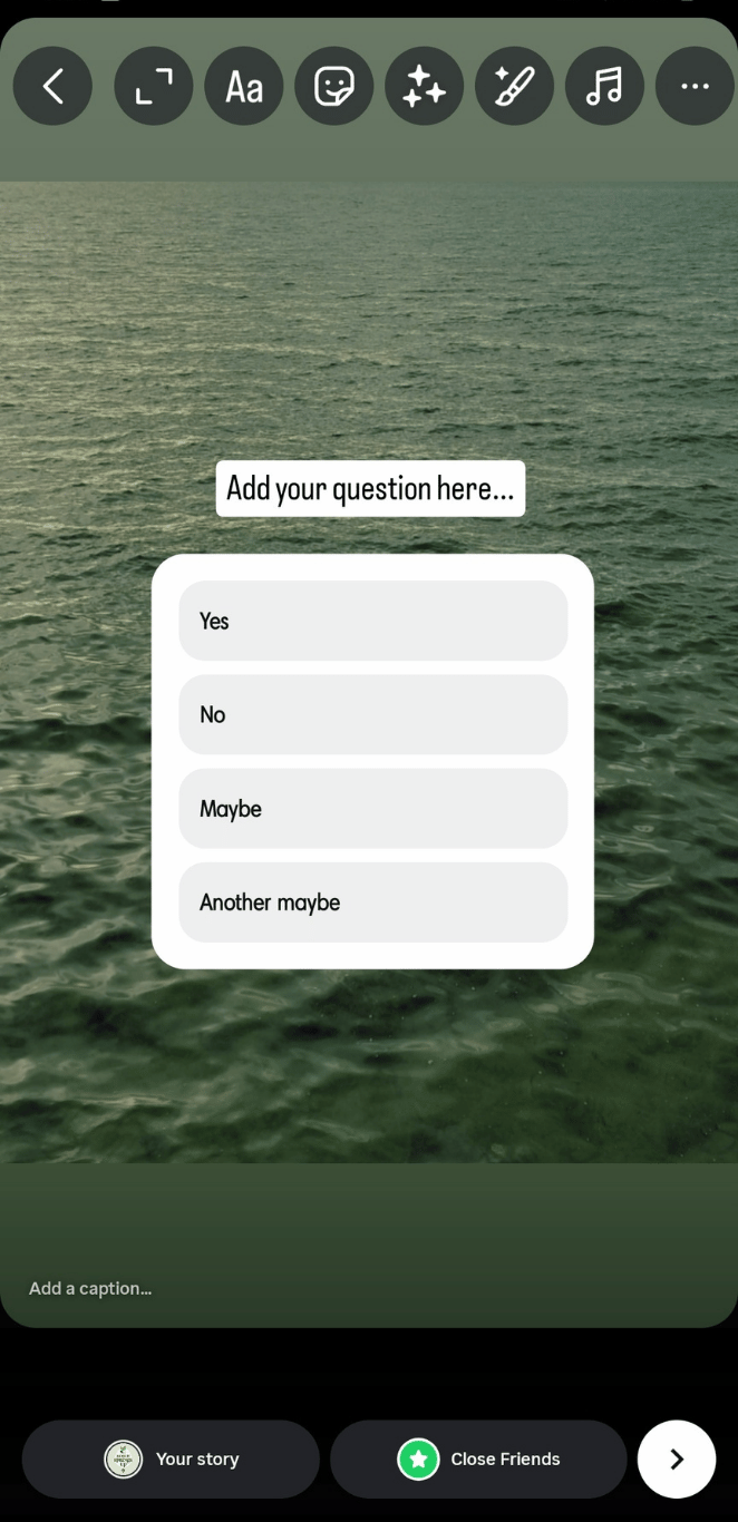 After typing your question, select how you want to publish it: tap Your Story, Close Friends, or the Share arrow to access more posting options.