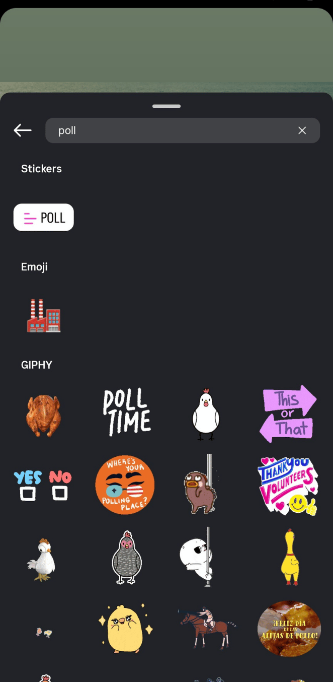 To create a poll, open the Stickers drawer and search for ‘poll.’