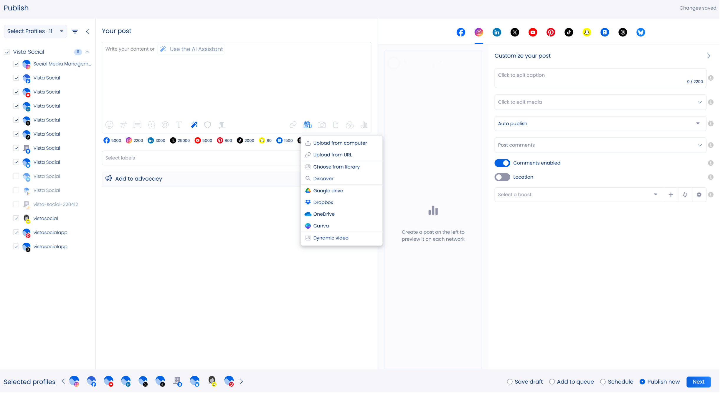 In the Publisher window, click the video icon and select where to upload your video. Ensure your client’s Instagram profile is selected under Social Profiles on the left.