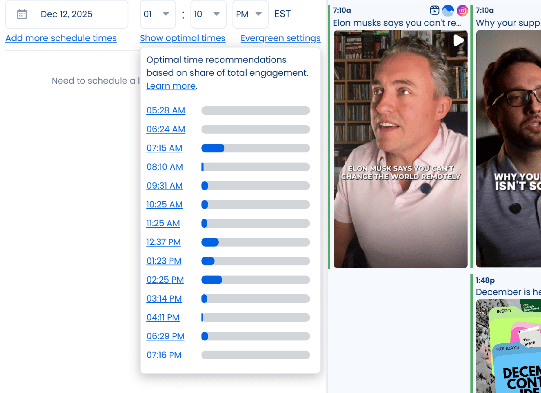 Use the interactive calendar and drop-down menus to set your schedule. Or, click ‘Show optimal times’ and choose from Vista Social’s publishing time suggestions, which are based on your campaign’s past user engagement data and the platform’s optimization algorithms.