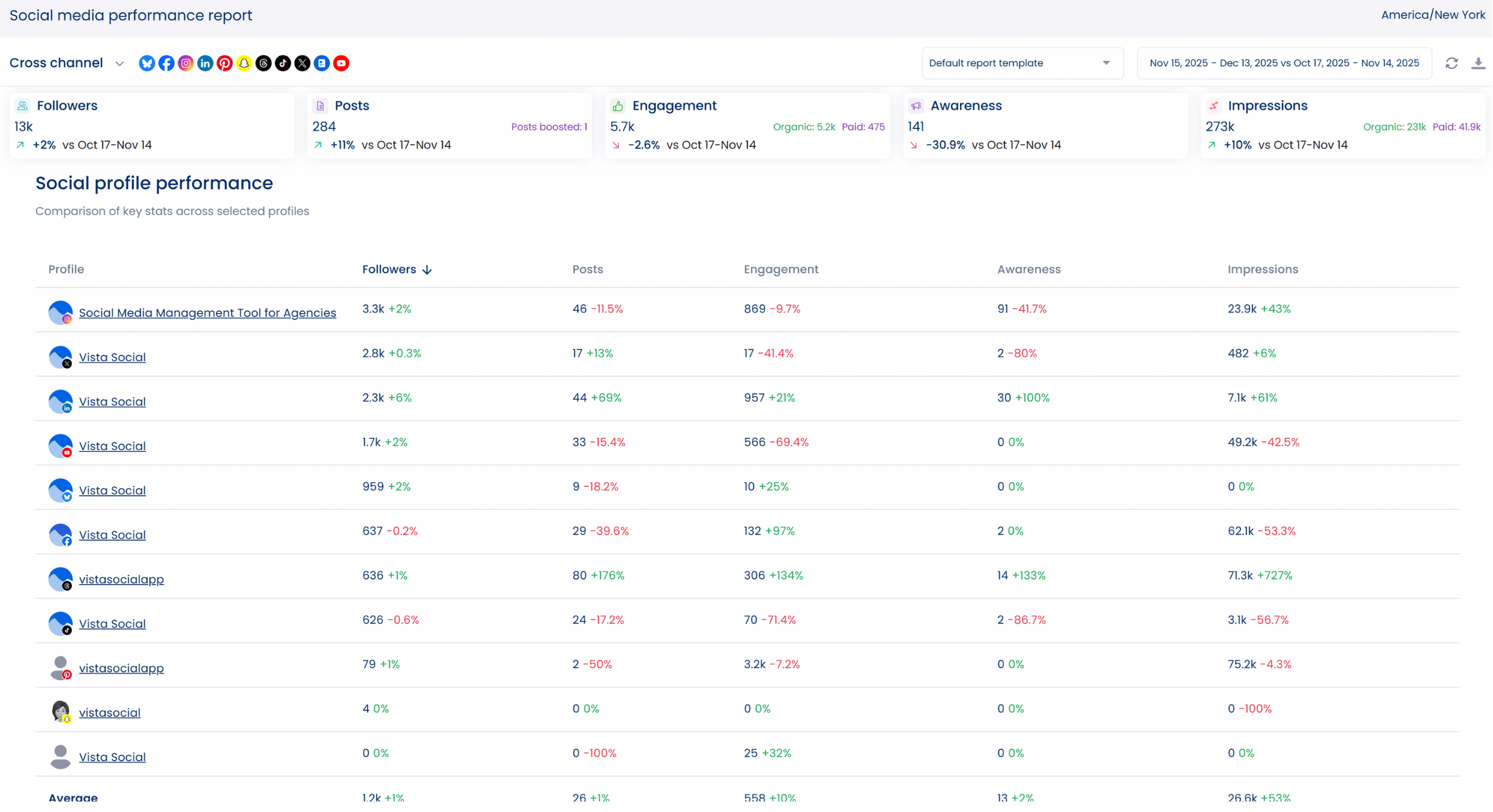 You can create custom reporting templates and schedule your reports to send them to your team or clients automatically. Sharing social media reports is also easier than ever since Vista Social now lets you send shareable links. You can also export your reports as PDF and CSV files and attach them to your emails.