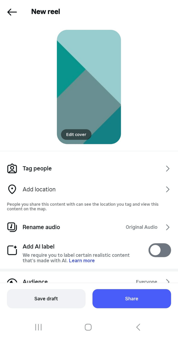 On the “New reel” page, you can write a caption, insert hashtags, create a poll, tag other users, add location information, and specify the audience.