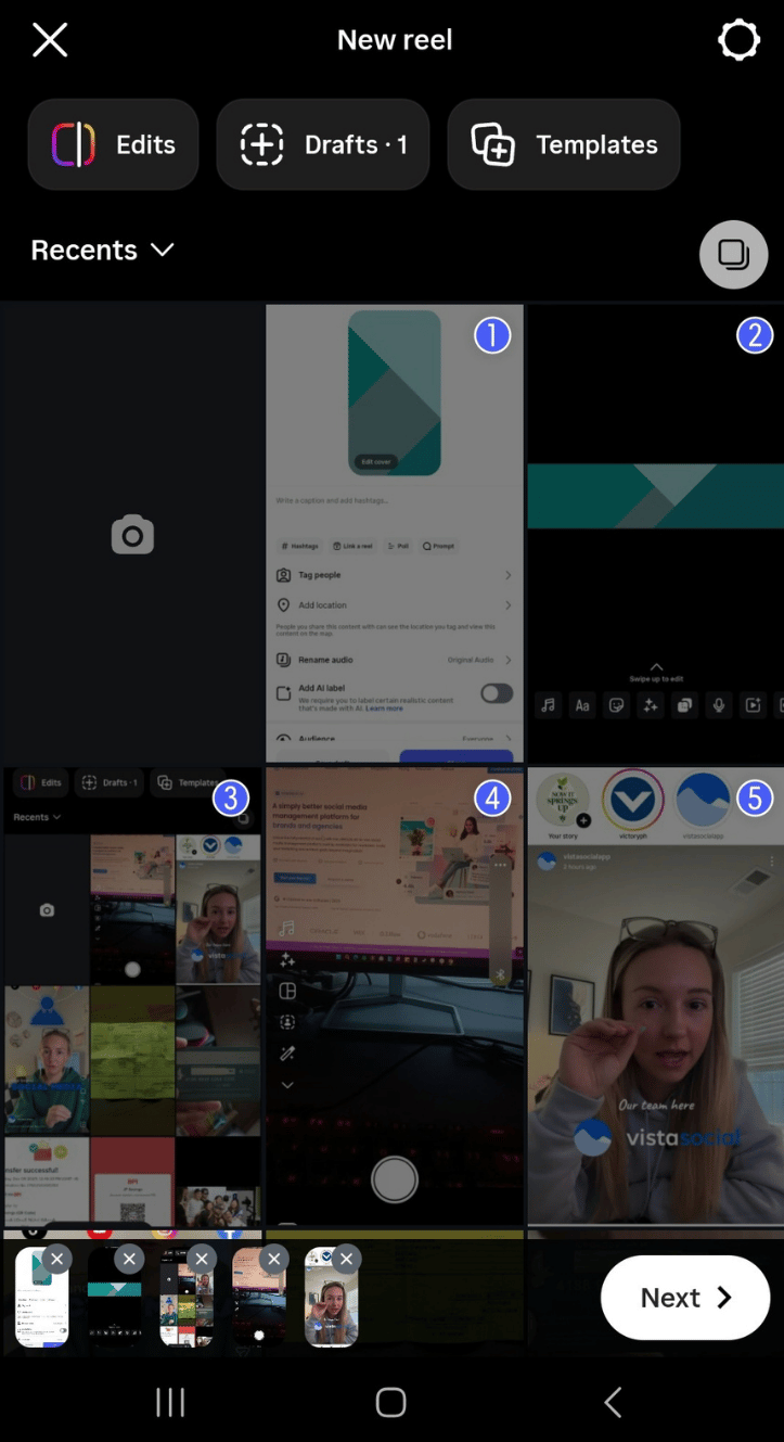 Create a reel and tap the gallery icon. Select the photos and videos you want to include in your reel—you can change their arrangement later.