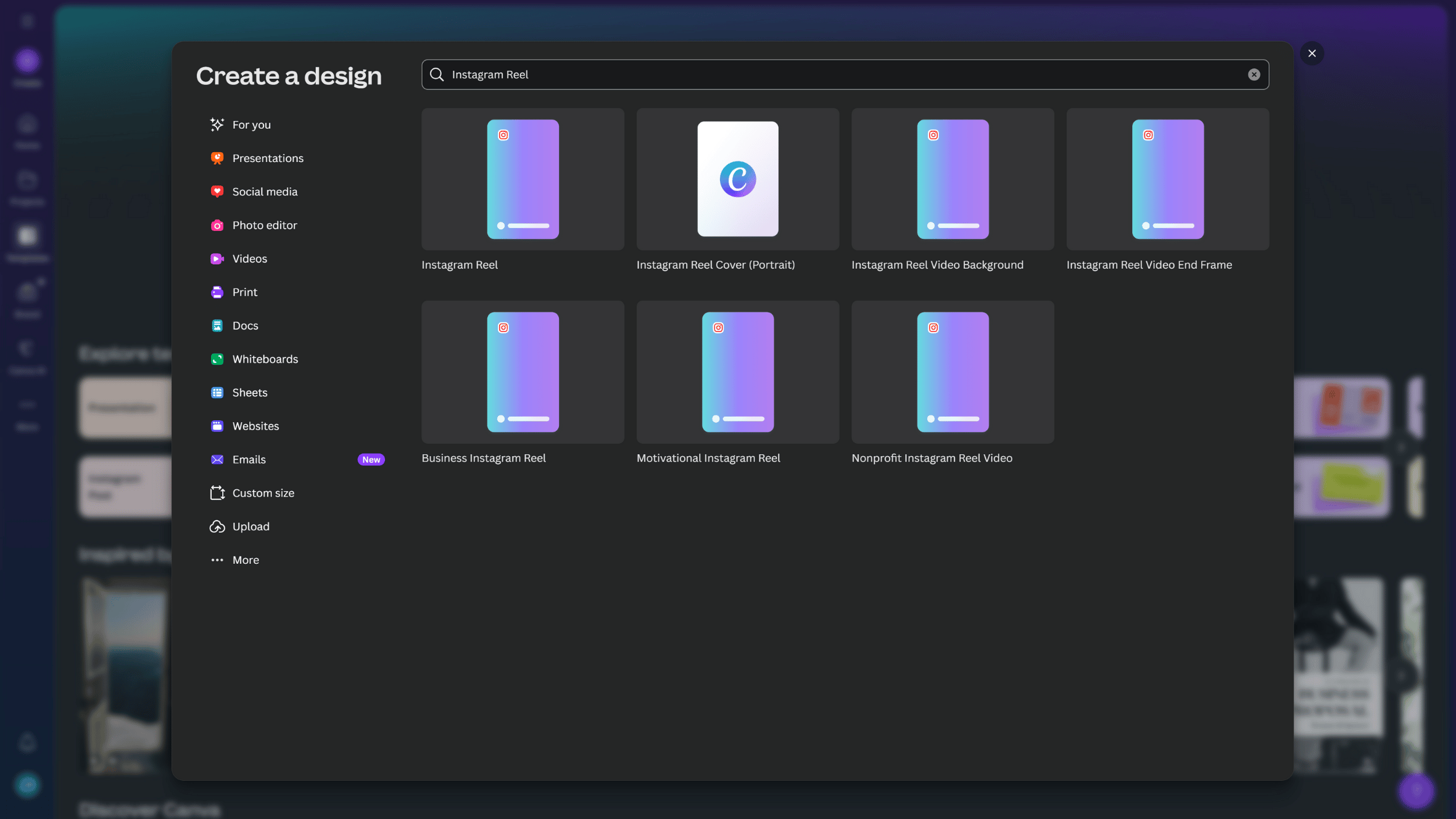 Type in “Instagram Reel” to search for templates and choose your preferred one from the results.