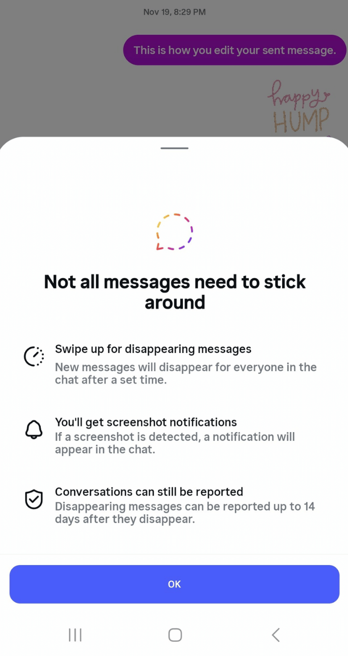In Vanish Mode, Instagram shows screenshot notifications for all content shared inside the chat, including messages and visual media.