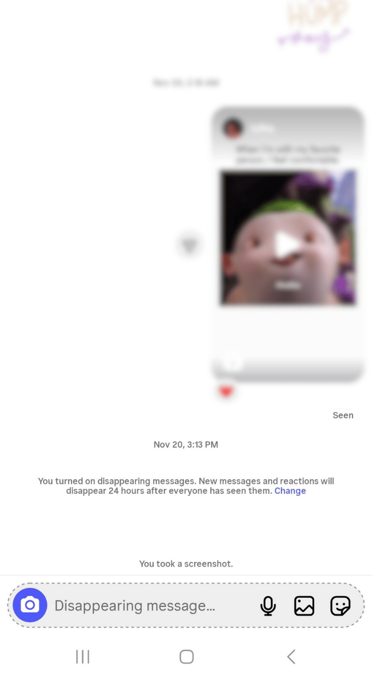 - Disappearing media: Instagram will also send a screenshot notification if the recipient took a screenshot of a disappearing photo or video.