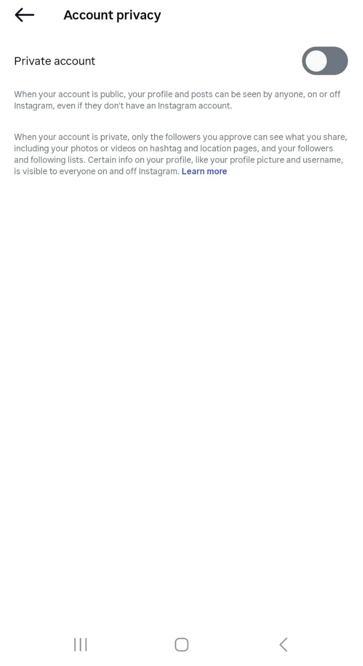On the “Privacy” page, tap the ‘Private account’ toggle to switch to a private account.