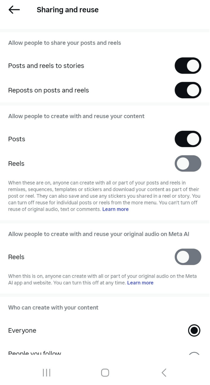 From the “Privacy” page, tap ‘Sharing and reuse.’ Use the toggles to disable remixing for Reels, feed videos, and photos.