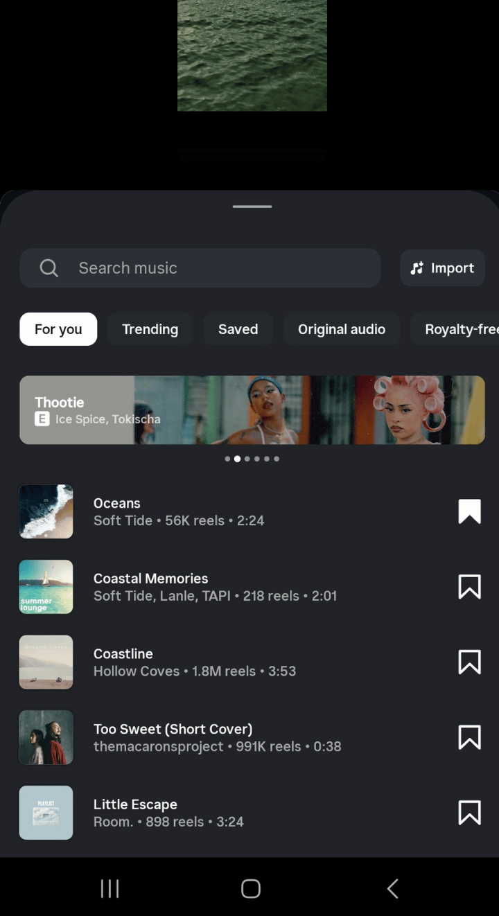 Pick from the suggested audio clips or search for a song using the top search bar. Instagram’s commercial music library gives business accounts a solid selection of licensed tracks, although the exact catalog still changes based on regional licensing rules. Feel free to preview any audio click by clicking the play button to the right.