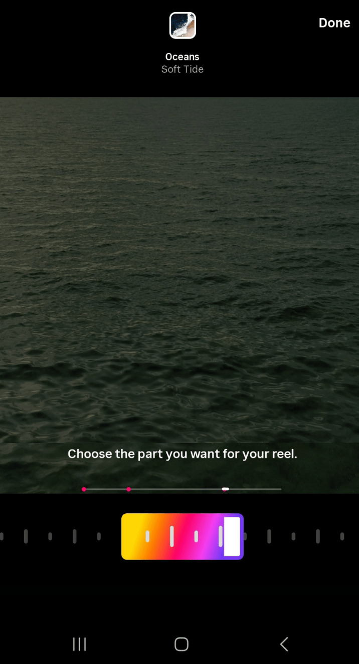 Once you find the audio you want to use, insert it into your reel by tapping on its name. Use the timeline scrubbing tool at the bottom to set which part of the clip gets played alongside your reel video.