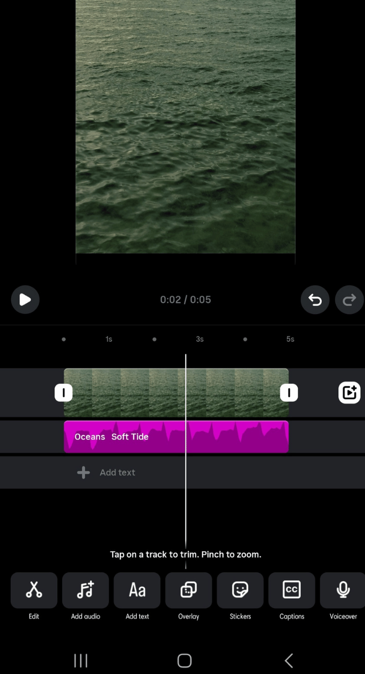 Tap the music icon again on the top menu to balance the volume of the original and inserted audio clips. You can also use the voiceover and sound effect tools at the bottom to further customize your reel’s audio.