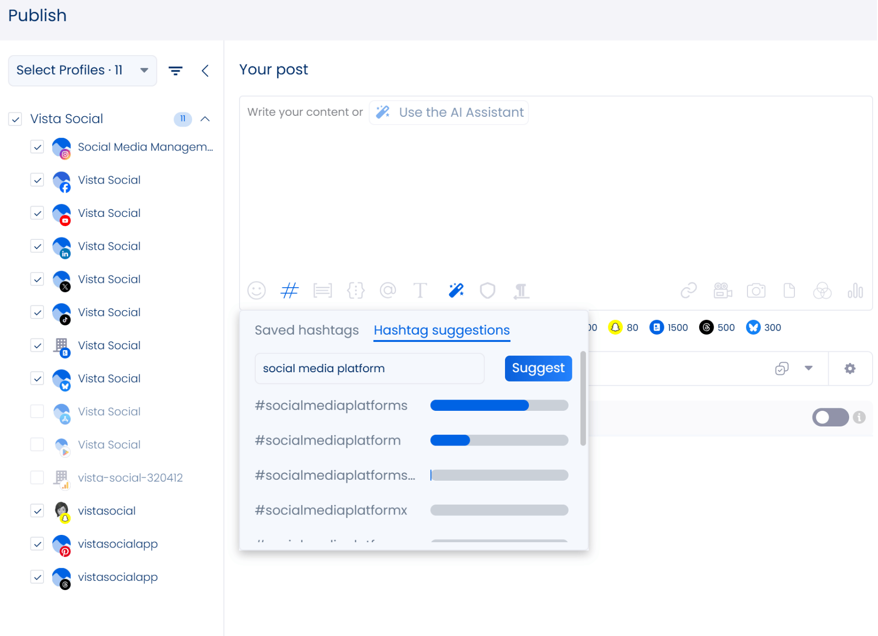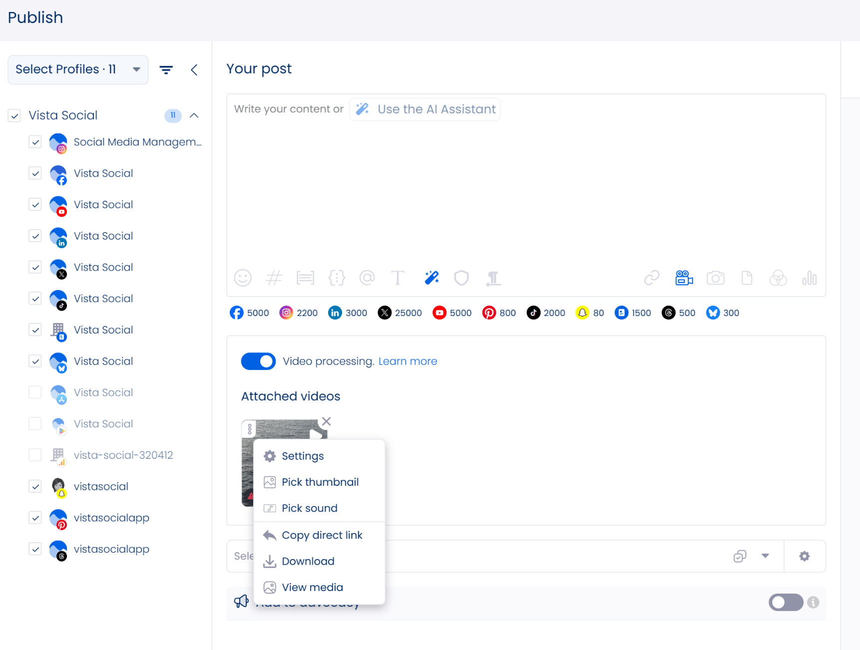 - Robust content creation and publishing features: Whether you want to publish a single post or in bulk via multiple sources, Vista Social can help you with one interface.